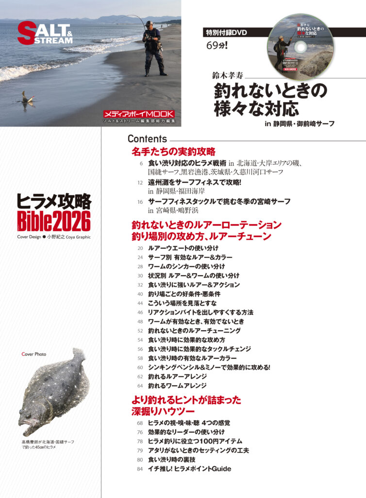誌面内容は名手の実釣攻略の他、ルアーのヒラメ釣りに役立つ内容が満載です。